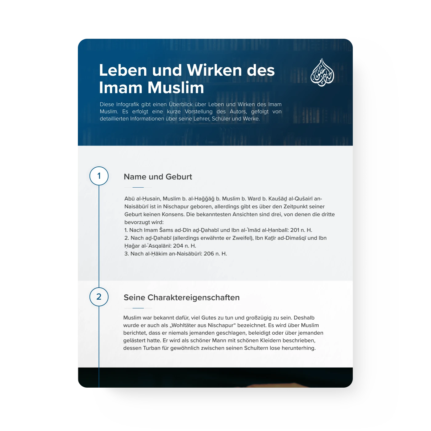 Diese Infografik gibt einen Überblick über Leben und Wirken des Imam Muslim. Es erfolgt eine kurze Vorstellung des Autors, gefolgt von detaillierten Informationen über seine Lehrer, Schüler und Werke.